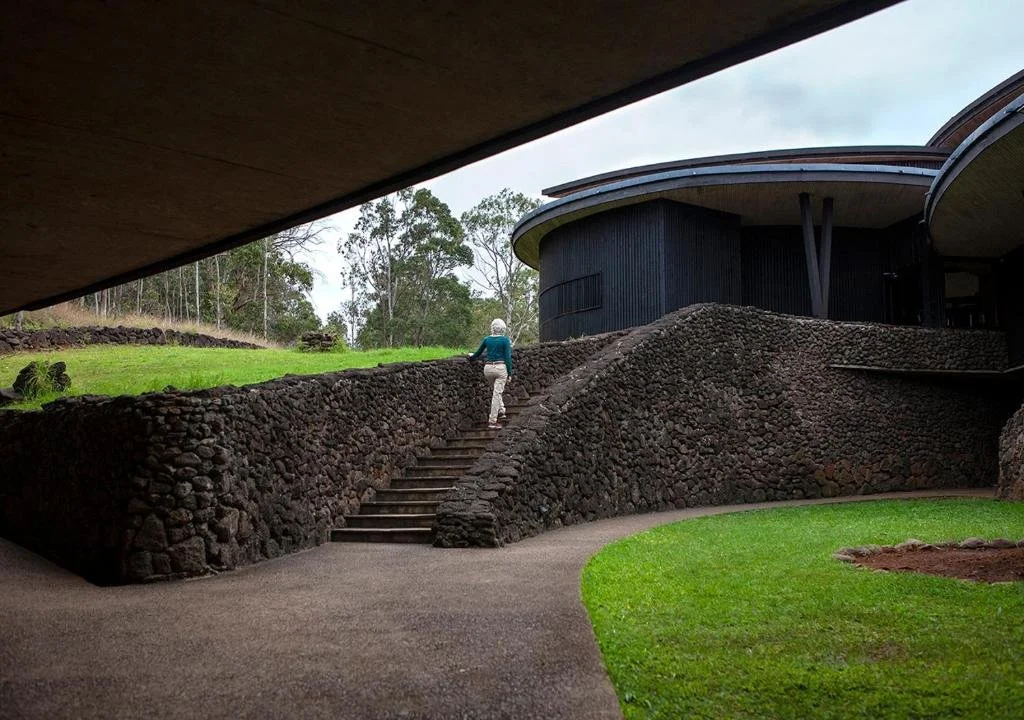 靈感源自復活節島古聚落 Orongo 的圓形石屋,草頂與火山石建材展現與自然共生的理念。